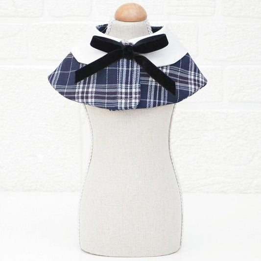 Dog Shawl Small Cloak Pet Bow Ttie Saliva Towel Pet Accessories - Size S - Navy Blue Grid